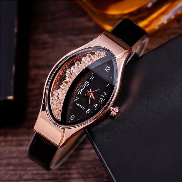 New Elegant Women Crystal Oval Dial Quartz Wrist Watches Lady Leather Strap Casual Watch Gift